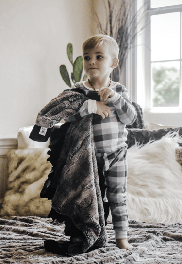 This luxurious plush blanket has soft faux fur on both sides and is framed with a silky satin ruffle. It measures approximately 34" X 34" and is made in the USA.