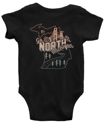 Dress your little one in style with the Happy Little Michigan Bodysuit. This adorable black onesie features out vibrant Happy Little Michigan design. It's the perfect way to showcase your family's love for all things Northern Michigan while keeping your baby comfy and cute.