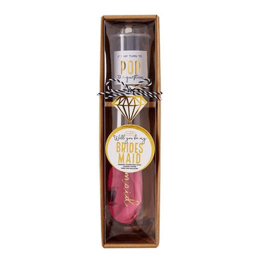 It's your turn to pop the question to your girls with this 3-piece Bridesmaid gift set. This set has a Bridesmaid themed stemless champagne glass that arrives gift boxed with confetti popper. It also contains three balloons and a "Will you be my bridesmaid?" gift tag.