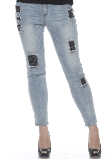 "Patchy" Light Denim Crop Jeans with Zip and Button Fly, Front and Back Pockets, Cuffed Ankles and Black Distressed Patches with Black Rhinestones Down Legs. Fabric: 72% Cotton, 26% Polyester, 2% Spandex. Combo: 97% Cotton, 3% Spandex