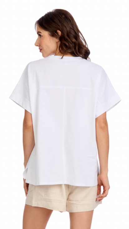 Elevate your wardrobe with this stunning sequin and tinsel appliquéd cotton blend top, designed to add a touch of glamour to any outfit. Crafted with meticulous attention to detail, this top features eye-catching sequin and tinsel appliqués that shimmer beautifully, making it perfect for both day and night occasions. The dolman short sleeves offer a relaxed and comfortable fit, while the side slit hem adds a modern twist to the classic silhouette. Designed to be versatile, this top comes in a one-size-fits-most style, ensuring a flattering fit for a variety of body types. Measuring approximately 27 inches from shoulder to hem, it provides ample coverage and a chic, laid-back look. Made from a high-quality blend of 60% cotton and 40% polyester, this top offers the perfect balance of softness and durability, ensuring it remains a staple in your wardrobe for seasons to come. Whether paired with jeans for a casual outing or dressed up with a skirt for a special event, this top is sure to make a statement.