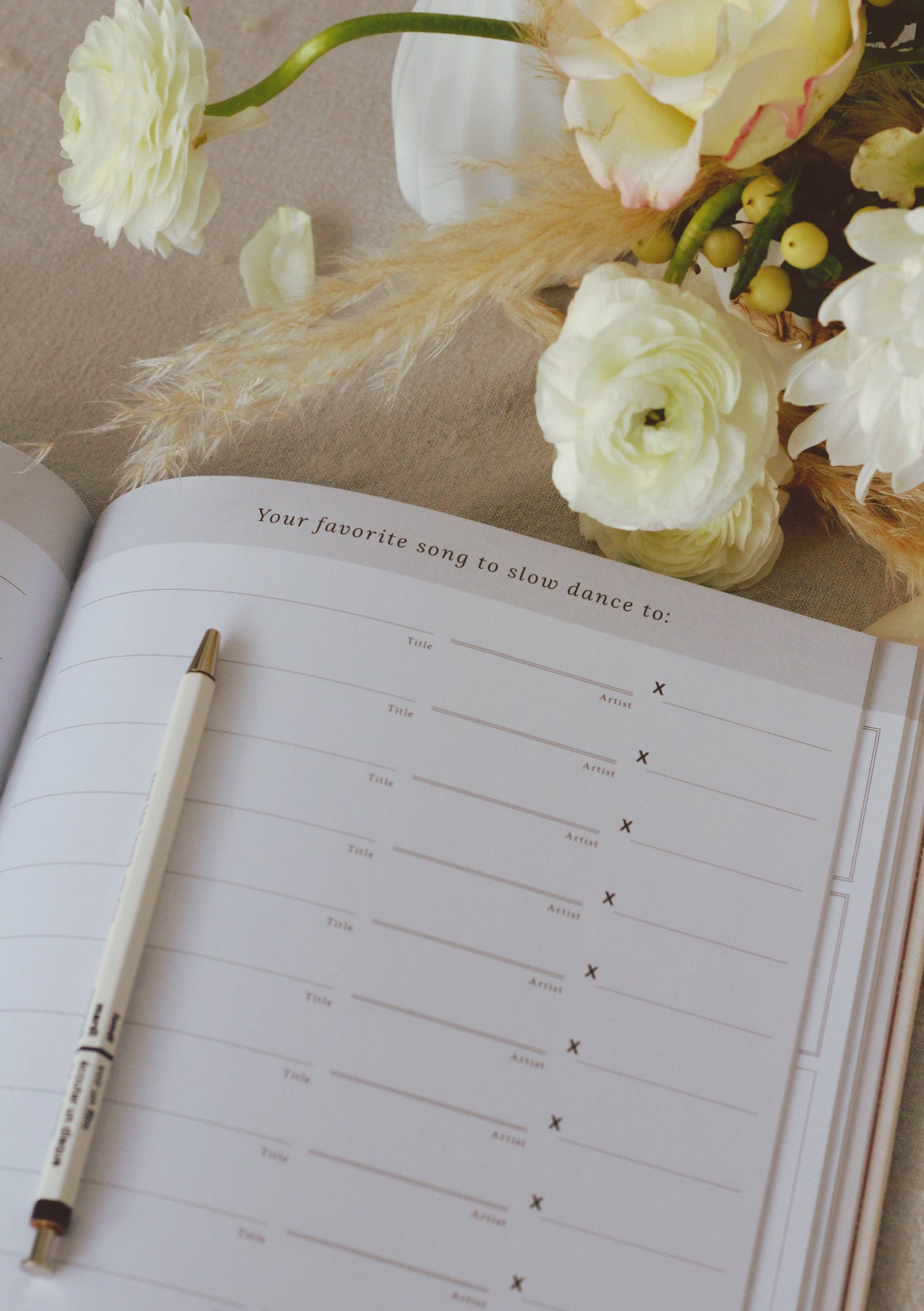 We designed it to look like a pretty book, but what makes our guestbook really unique is the fun prompts held inside the pages. Not only will you and your spouse share the joy of reading your guests’ answers to questions like “How should we get through our first married fight?” but it will give your friends and family a fun activity at the wedding.