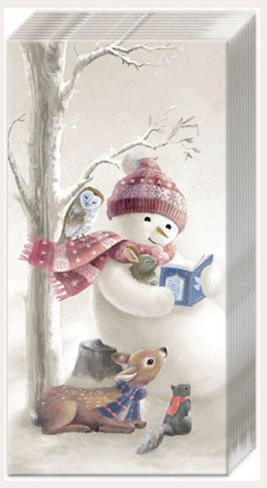 Additional Info: Bedtime Stories Theme - This delightful image captures the heartwarming moment of a snowman reading a bedtime story to woodland creatures under the serene, snowy branches of a tree. The cozy winter illustration brings a sense of warmth, magic, and companionship perfect for the season. - snowman, bedtime story, woodland animals, winter, scarf, snow-covered tree, cozy, hat, calm, night time.