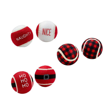 Give your furry friend a dose of holiday cheer with our Christmas Festive Dog Tennis Balls! This playful set of three includes fun, seasonal designs: one ball features Santa’s classic belt with a joyful ‘Ho Ho Ho’ on the reverse, the second showcases a cozy red and black flannel pattern, and the third lets your pup show their mood with ‘Naughty’ on one side and ‘Nice’ on the other. Perfect for gifting or adding a festive twist to playtime, these tennis balls are ready to bring Christmas spirit to your dog’s game!"