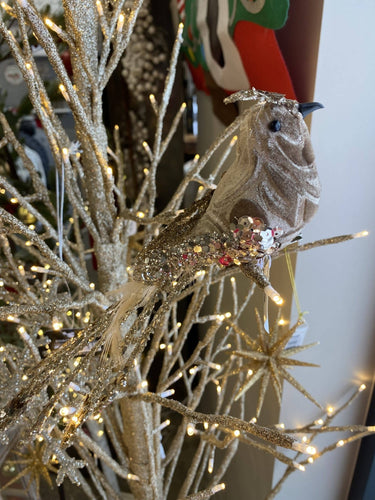 Add dramatic texture to your tree or garland with this beige bird ornament styled with feathers, sequins and beading. Complete with a clip-on feature for secure placement. Foam, Plastic, Wire.