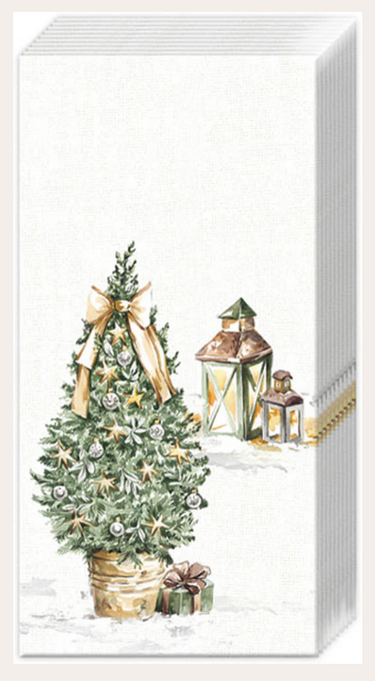 Additional Info: (Holiday and Welcome) This beautifully designed tissue packet features a festive Christmas theme, with a lovely green tree adorned with gold ribbons and stars, creating a warm and welcoming seasonal atmosphere. The background is white, and the accents in brown and gold add a touch of elegance, perfect for welcoming guests during the holiday season. - (Christmas, holiday decoration, festive, warm welcome, tissue packet, elegance, seasonal décor, winter, celebration, gift wrapping)