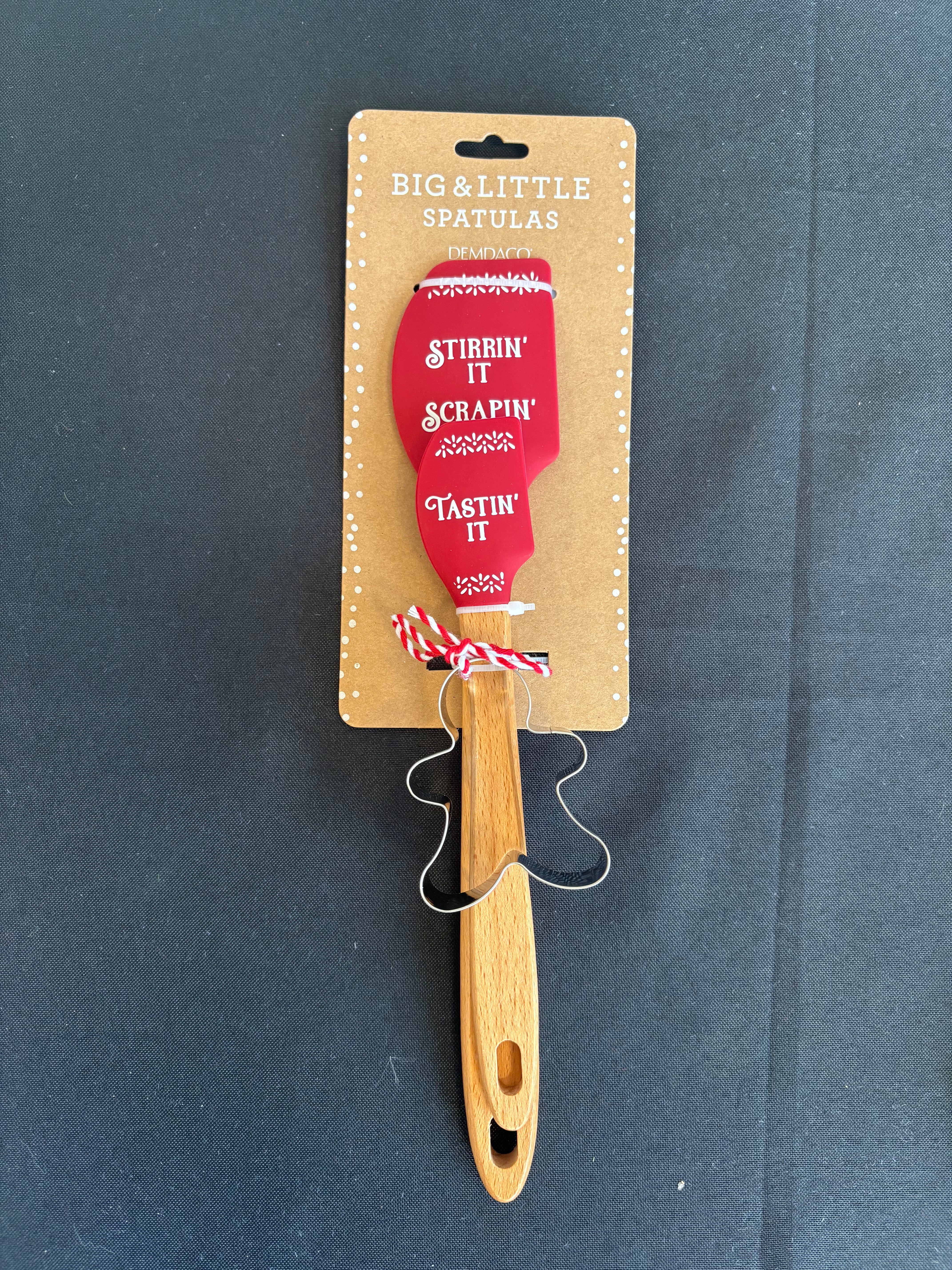 Add a festive touch to your holiday baking with these cheerful DEMDACO spatulas. Each spatula features a durable wooden handle paired with a heat-resistant red silicone head, printed with playful holiday phrases to spread seasonal joy. The set is beautifully accented with a coordinating cookie cutter, tied on with a decorative ribbon—making it both functional and gift-ready.