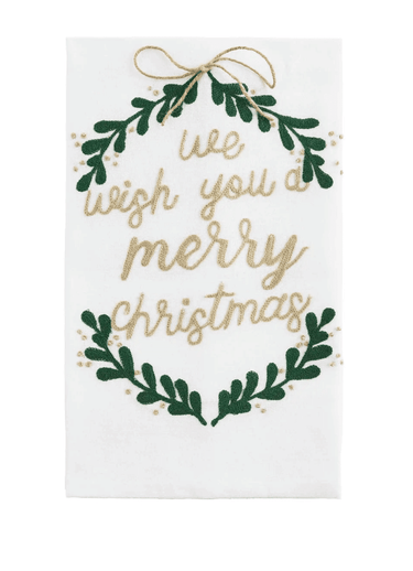 Send good tidings to your house guests with our Wish You Christmas Greenery Towel. The embroidered cotton hand towel features hand-knotted French knot detail. The towel features greenery and white details. This towel should be spot cleaned only, do not wash in machine.
