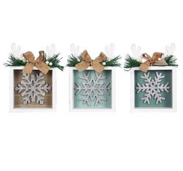 NOT A SET Introducing our Wood Frosty Winter Tabletop Framed Snowflake Design with Reindeer Antlers, 3 Ast. a collection of stunning decorative pieces that bring warmth, nature-inspired beauty, and a touch of rustic charm to your tabletops. Crafted from high-quality wood and designed with meticulous craftsmanship, these decor pieces add a natural and organic element to your living space. Our Wood Tabletop Decor collection features a variety of items, including carved sculptures, candle holders, trays, and figurines. Each piece showcases the unique grains, textures, and hues of the wood, adding visual interest and creating a cozy and inviting atmosphere. Dimensions: 5(L) 1.5(W) 8(H)