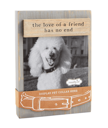 The Gray Dog Collar Frame is a stylish and functional addition to any pet lover's home. Crafted from high-quality pine wood, this magnetic wooden block frame is designed to hold a 4" x 4" photo securely in place. The included magnet ensures that your cherished memories will stay in position, allowing you to showcase your favorite picture of your furry friend. To add a touch of uniqueness, the frame features a kraft dog collar wrap that not only adds a decorative element but also suggests a creative way to secure your dog's collar around the frame. This innovative design allows you to personalize the frame with your pet's collar, adding a sentimental and personalized touch to your home decor. With dimensions of 6 1/4" x 4 1/2", this Gray Dog Collar Frame is the perfect size to display on a shelf, desk, or any other surface. Its compact yet eye-catching design makes it a versatile piece that can easily fit into any room or style of decor. Whether you're a dog owner yourself or looking for a thoughtful gift for a fellow pet lover, the Gray Dog Collar Frame is a must-have accessory. Its combination of functionality, style, and personalization makes it a unique and meaningful way to showcase your love for your furry companion.