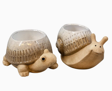 Slow and steady will win the race, but this charming pair will immediately win YOU over! Use it for your indoor decor, or even as a charming patio accent. These whimsical little planters will add personality to a favorite succulent, an artisanal look that will suit your themes without fail. Set them on your windowsill to soak up the sun! *This is an assortment, not a set.