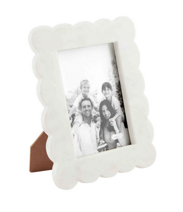Display your most treasured memories with our Large Scalloped Picture Frame. The scalloped marble 10 1/4" x 8 1/4" frame holds a 5" x 7" picture in the center. The marble frame stands with a back easel. The frame features a beautiful cream marble coloring and scalloped details.