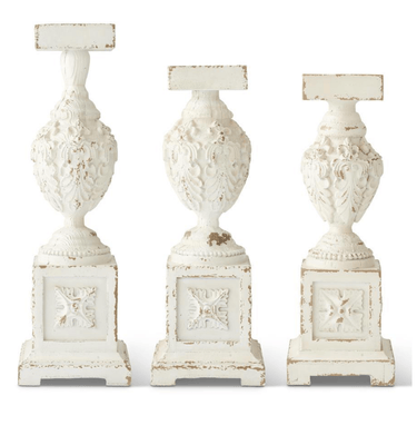 NOT A SET Elevate your home decor with the Whitewashed Wooden Candleholders with Carvings by K&K Interiors, available in three captivating sizes. These exquisite candleholders bring a touch of rustic charm and elegance to your living space. Crafted with meticulous attention to detail, these candleholders feature a whitewashed finish that adds a sense of vintage allure to your decor. Each one is adorned with intricate carvings that evoke a sense of timeless craftsmanship and artistry. Choose from three distinct sizes to suit your decor needs, whether you prefer to use them individually as accents or create a captivating display with all three. These candleholders provide flexibility in decorating your space, allowing you to set the perfect mood for any occasion. The Whitewashed Wooden Candleholders with Carvings are not just decorative; they are also functional pieces that hold your favorite candles, creating a warm and inviting atmosphere. Embrace the rustic beauty and versatility of these candleholders from K&K Interiors and add a touch of rustic elegance to your home. Item Dims: Grad. Sizes 25H x 8W x 8D Major Materials: Polyresin Prod Info 1: SM 21"H x 7.25"W x 7.25"D MD 22"H x 8"W x 8"D