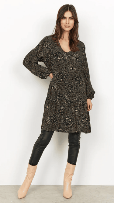 The Gillian is a feminine dress in a 100% responsible produced viscose quality. The dress has a v-neckline, long sleeves, a lay at the skirt and a beautiful print. Style this under a knitted waistcoat and with a white sneaker.