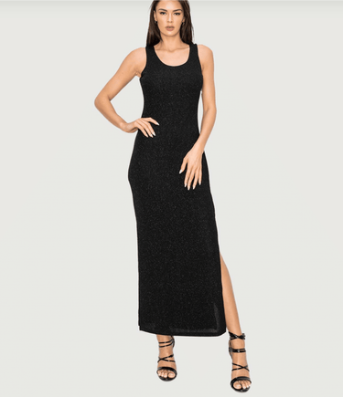 Be a show stopper at all holiday parties in this black glitter maxi sleeveless dress.