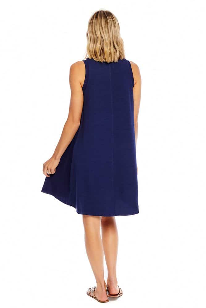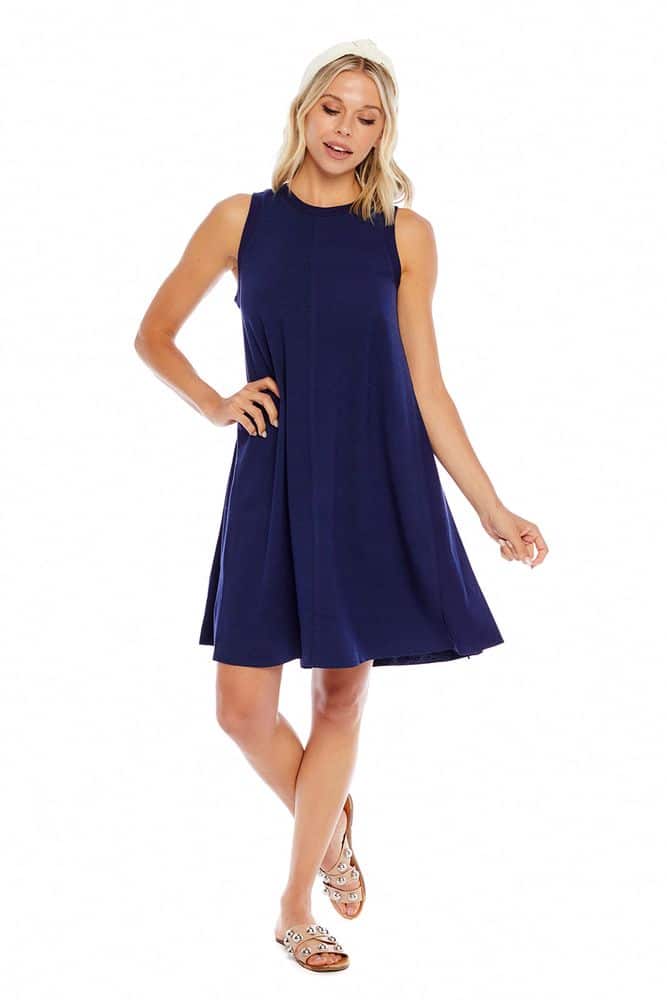 Our Inman navy ribbed dress is understated and cool. The rayon blend swing hem dress features ribbed side panels that add touchable texture. The dress also features a ribbed sleeve binding and neckline. This dress measures approximately 34" from shoulder to hem on size small.