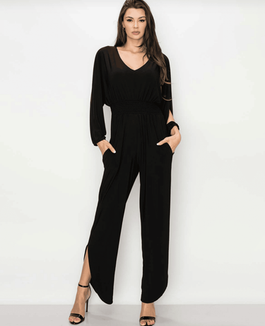 Sleek and sexy black jumpsuit with slits in the pants..