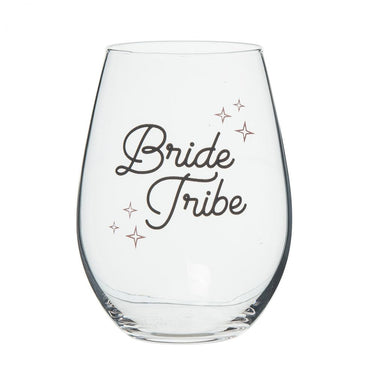Glass wine glass featuring the saying "Bride Tribe" in black accented with pink stars