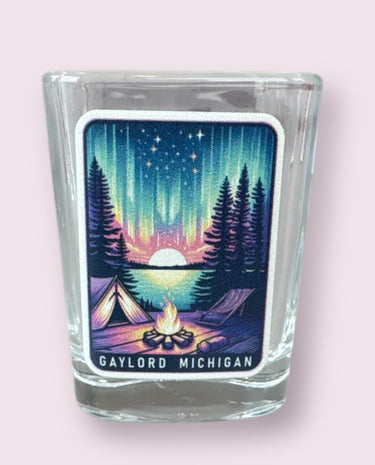 Capture the beauty of Northern Michigan with this clear short square shot glass, featuring our exclusive Ruffled Feather Gaylord Michigan design. Showcasing a stunning lake at sunset, a cozy campsite, and a crackling fire, this design perfectly represents the peaceful charm of camping in Michigan’s summer season.