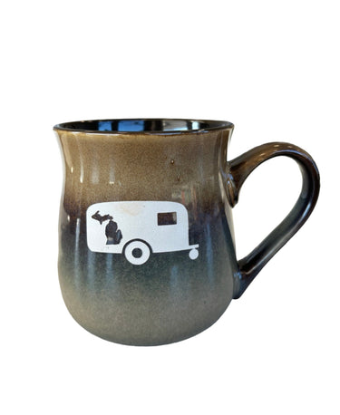 This is a 26 ounce El Grande Sandblasted Tan to Beige Rustic Mug with a Michigan Camper design is sandblasted (cut) into the ceramic which means it is not only permanent but both dishwasher and microwave safe. No need to worry about the handle getting hot! I personally test all my mugs prior to purchase to ensure that each handle is cool when it comes out of the microwave. No two mugs are identical in this line so each mug is unique to itself. Don't limit yourself to thinking these are just for coffee! We use them for tea, hot chocolate, soup, chili, stews and the list goes on! These make fantastic ice cream or beer mugs as well as they can be chilled in the refrigerator for 30 minutes prior to serving! The design is only on one side!