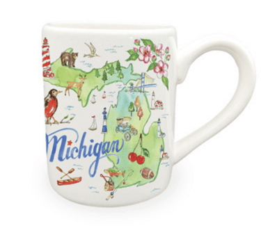 - MICHIGAN: White mug decorated with outline of the state and full-color accents that represent the Great Lakes State
