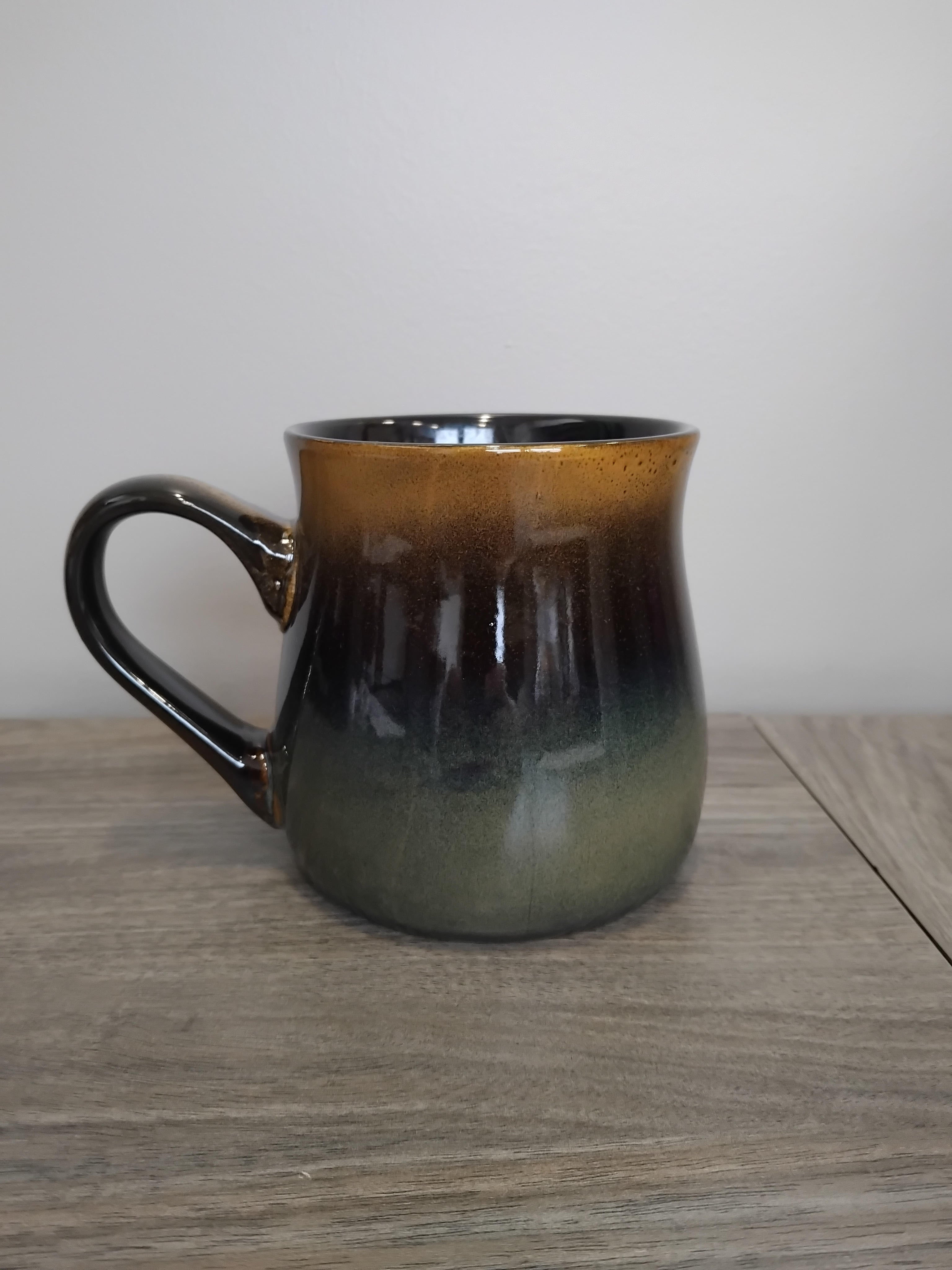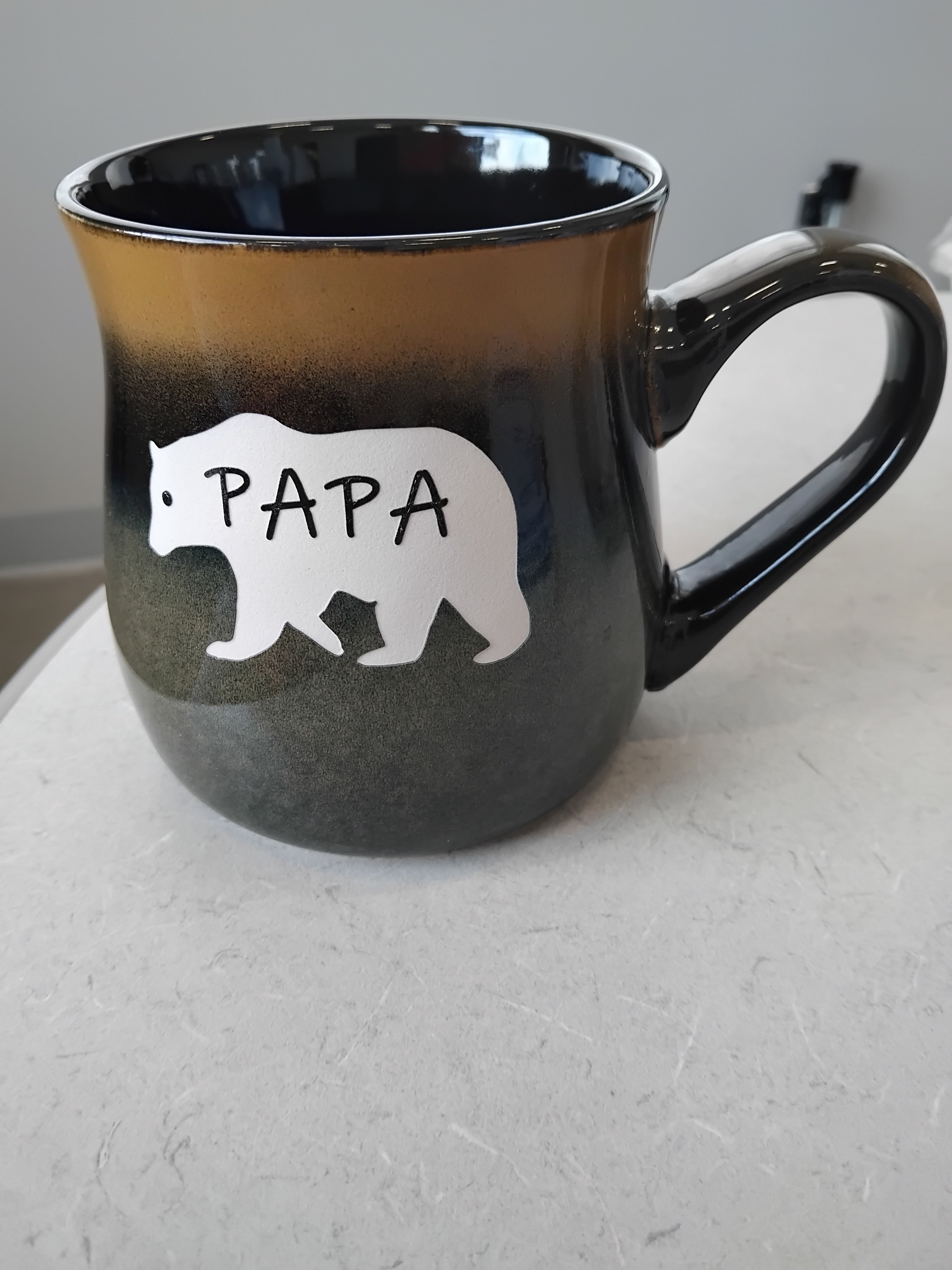 This is a 26 ounce El Grande Sandblasted Blue to tan or Beige to Brown rustic Mug with a Papa Bear or Mama Bear Design: The Papa Bear and Mama Bear design is sandblasted (cut) into the ceramic which means it is not only permanent but both dishwasher and microwave safe. No need to worry about the handle getting hot! I personally test all my mugs prior to purchase to ensure that each handle is cool when it comes out of the microwave. No two mugs are identical in this line so each mug is unique to itself. Don't limit yourself to thinking these are just for coffee! We use them for tea, hot chocolate, soup, chili, stews and the list goes on! These make fantastic ice cream or beer mugs as well as they can be chilled in the refrigerator for 30 minutes prior to serving!