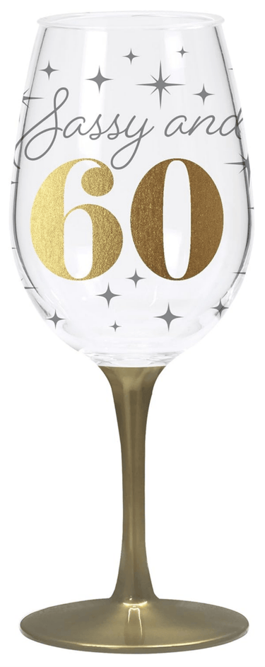 - This classy wine glass is a great way to ring in 60! The acrylic stem of this wine glass is gold, and the bowl features silver stars and ''Sassy and 60'' written in elegant script.