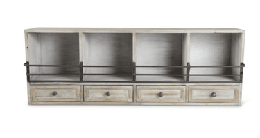 Need some storage? This whitewashed 4 drawer cubby shelf would be perfect to store any items that is needed. Cubby has metal railings.