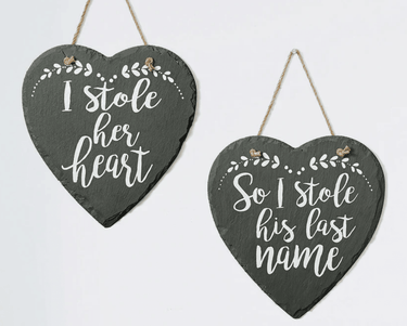 9 x 9" | Slate heart shape signs with burlap ribbon hanger