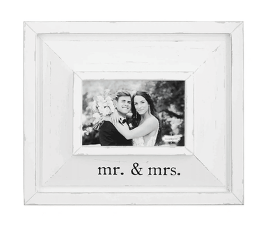 True love is a gift, keep it close with our Mr. and Mrs. Picture frame. The distressed mitered wood frame stands with an easel and features unique markings. The picture frame holds a 4" x 6" photo. Underneath the photo, the photo frame features the sentiment "Mr. & Mrs." in black.