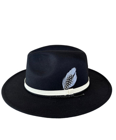 Introducing the Groom Themed Hat by Honky Tonk Hat Co., a distinguished piece that exudes sophistication and style. Crafted in a one-of-a-kind black Panama style, this hat is adorned with a cream ribbon and a feather, adding a touch of refinement to any groom's ensemble. Perfect for the discerning gentleman, this hat is a timeless accessory that adds a dash of elegance to any wedding day or special occasion.