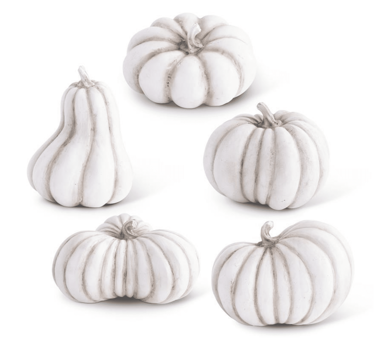Each pumpkin boasts a pristine white hue, adding a touch of sophistication to your space. The assortment of shapes ensures a diverse visual appeal, creating an enchanting arrangement that captures the imagination. Whether it's the classic round pumpkin, the elongated elegance of the pear-shaped variety, the graceful curves of the hourglass design, the whimsy of the scalloped edges, or the unique charm of the squat, squat mini-pumpkin, this assortment offers options to suit every taste.