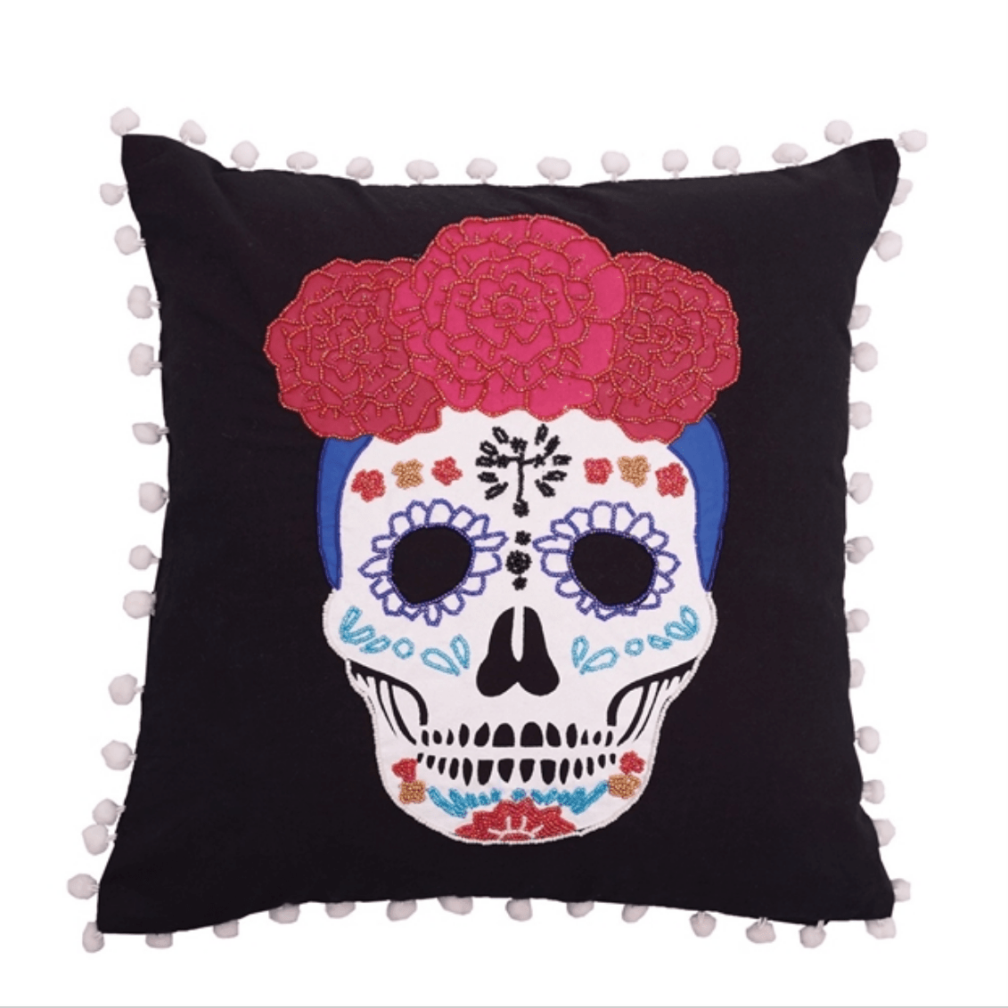 Decorate your home for the Day of the Dead with the festive design of the Sugar Skull Pillow. This cotton pillow features an iconic sugar skull topped with fuchsia marigolds, adorned with intricate beaded details, and framed by a fun pom-pom edge. Coordinate this captivating beaded accent with other Dia de los Muertos to complete your vibrant look for the holiday. Crafted with a cotton cover and removable polyester insert for easy care. Spot cleaning recommended. Size: 16-inches x 16-inches.