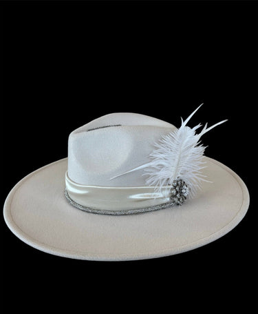 Introducing the Bridal Themed Hat by Honky Tonk Hat Co., a masterpiece of elegance and sophistication. This one-of-a-kind Panama style hat is adorned with delicate white feathers and an ivory satin ribbon, exuding timeless charm. Adding to its allure is a shimmering rhinestone broach and rhinestone ribbon, adding a touch of sparkle to any bridal ensemble. Whether for the bride or her bridal party, this hat is the perfect accessory for a memorable and enchanting wedding day.