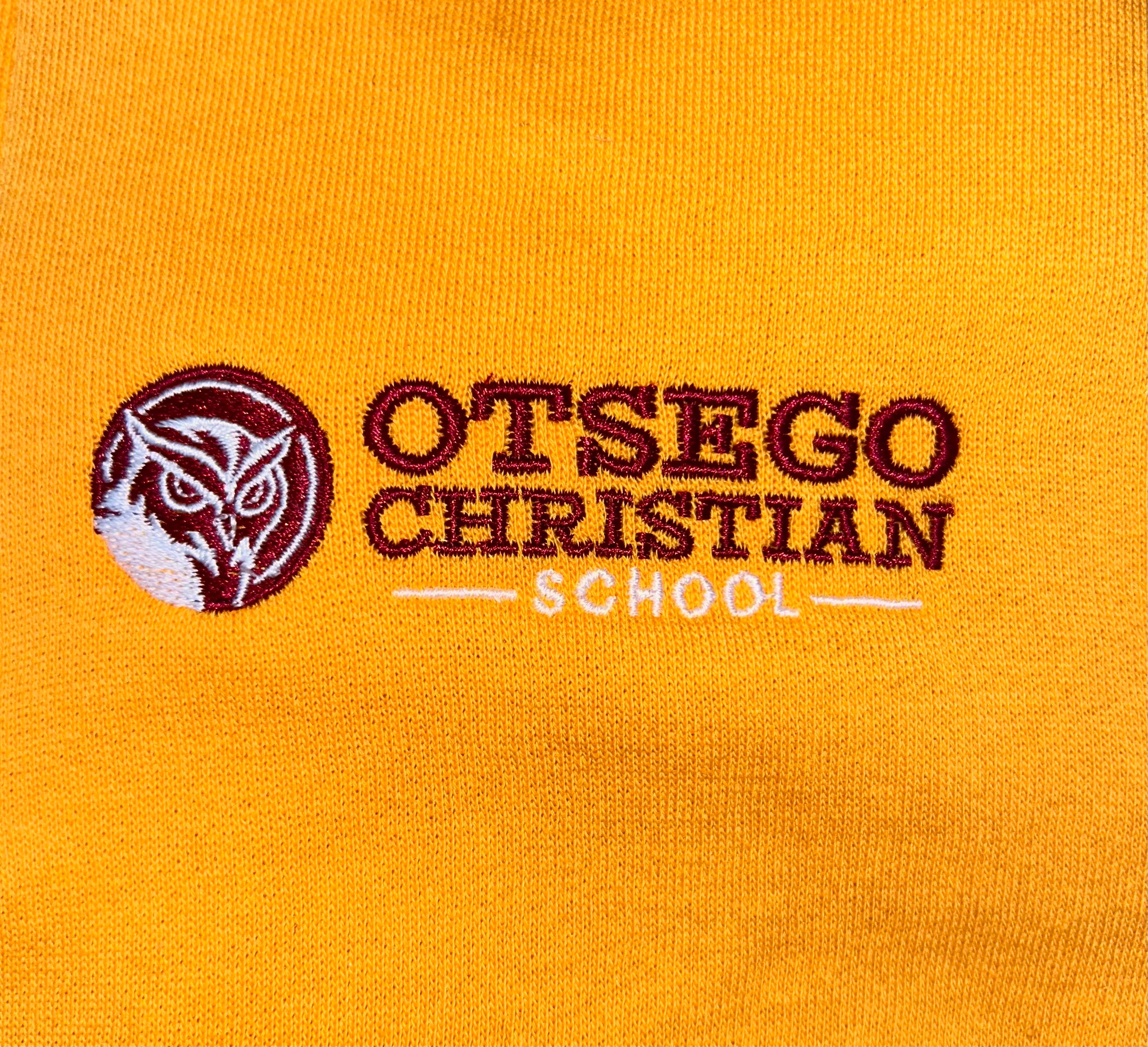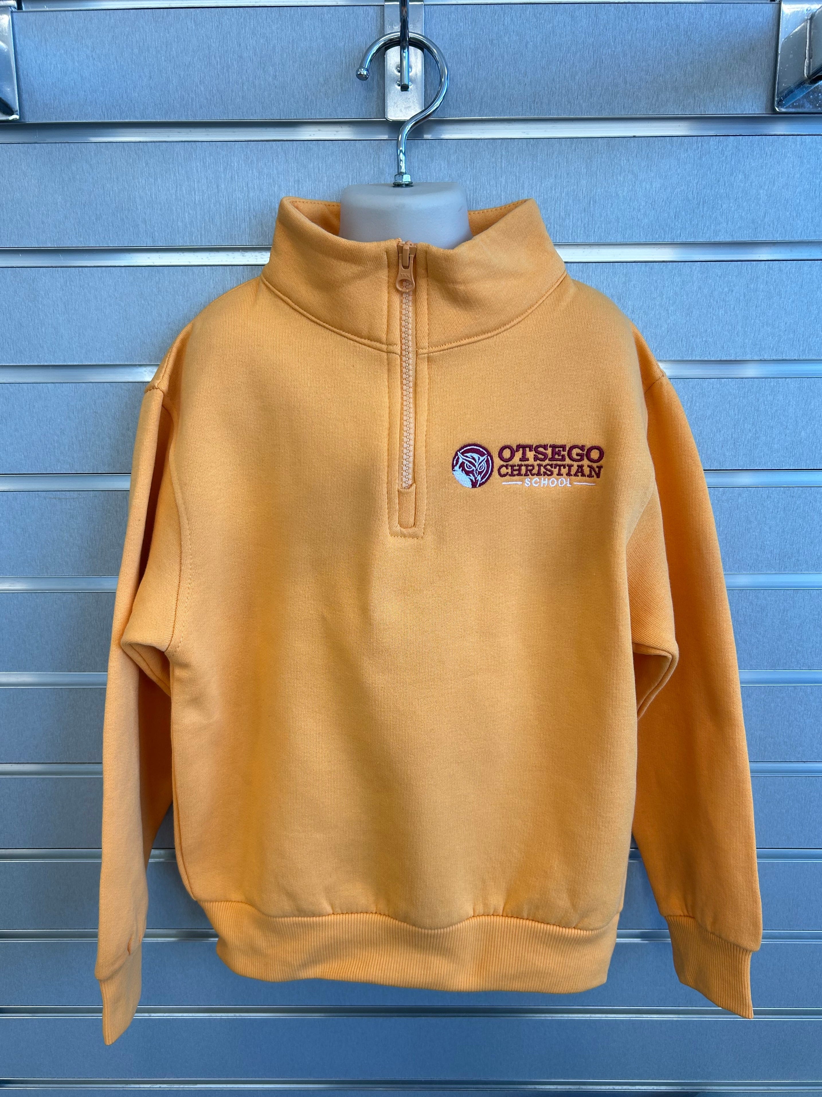 Keep your young OCS fan cozy and warm in this stylish Otsego Christian School youth quarter zip. Featuring a stylish owl logo with bold Otsego Christian School lettering. This quarter zip is perfect for cooler days, school events and everyday wear. Made from a soft breathable cotton blend fabric, perfect for your kids!