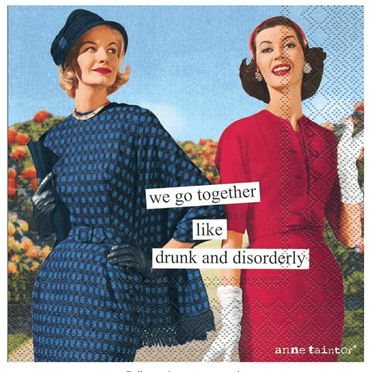 - FABULOUS RETRO DESIGN WITH A CLEVER ZINGER: Well-dressed besties pose in vintage glam: features phrase: We Go Together Like Drunk and Disorderly
