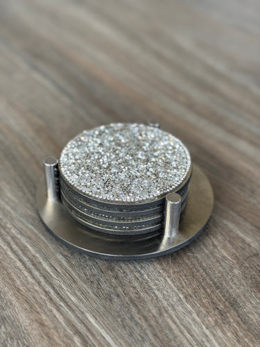 Add a touch of sparkle to your space with our Luminous Coaster Set, available in elegant charcoal or silver. Each set includes four glittery coasters that shimmer just right, all neatly stored in a sleek metal holder for easy organization and stylish display.