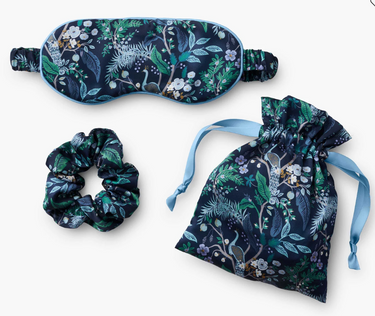 For sweeter dreams, make sure you pack our Sleep Travel Set, with a silky eye mask, scrunchie, and matching drawstring bag featuring our lush Peacock print.