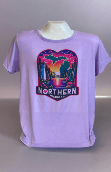 Embrace the tranquil beauty of Northern Michigan with our exclusive tee! Featuring a minimalist silhouette of the Mackinac Bridge, a lighthouse and our beautiful forest. Complete with bold 'Northern Michigan' lettering, outlined in a heart to show the love of our Michigan roots. A must-have for adventurers and nature lovers alike.