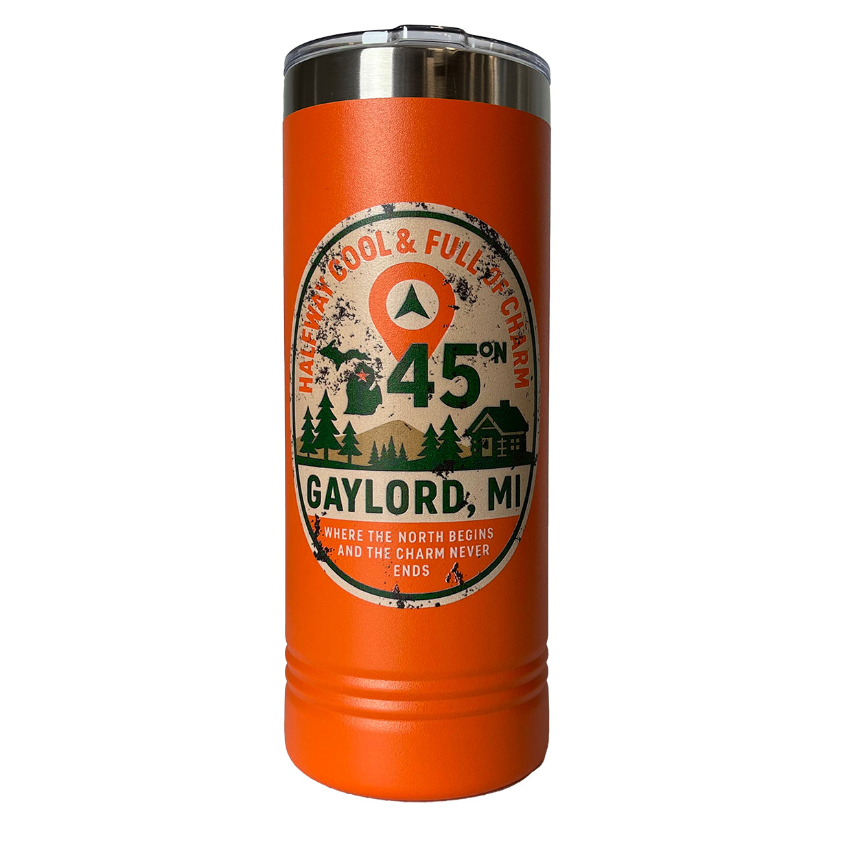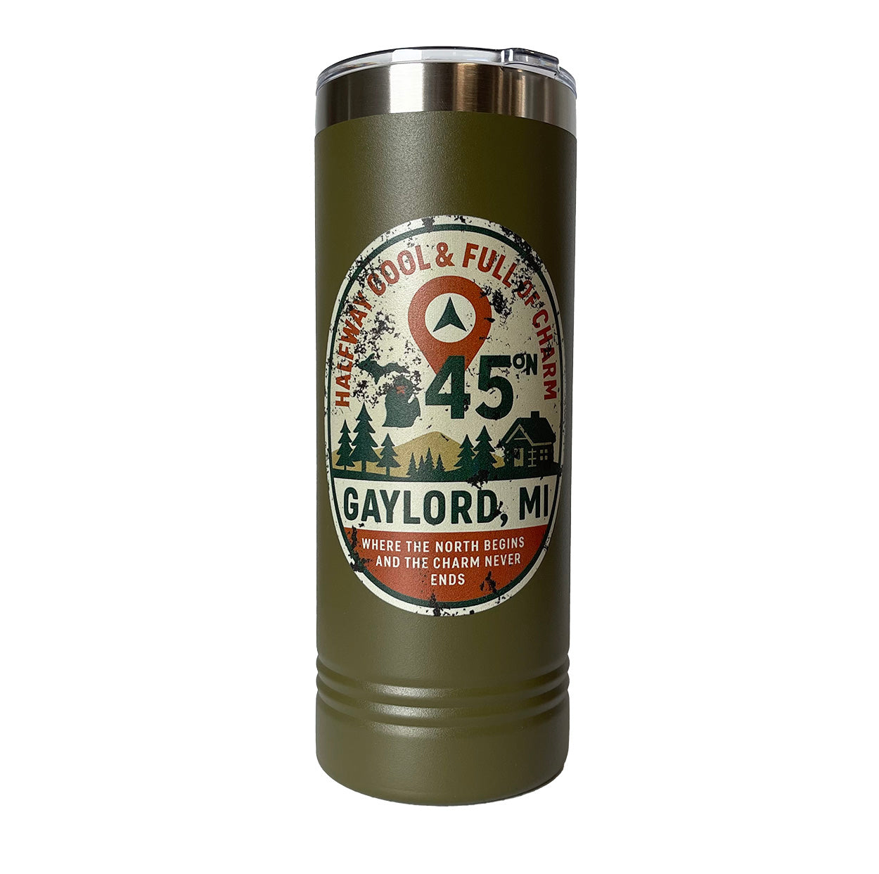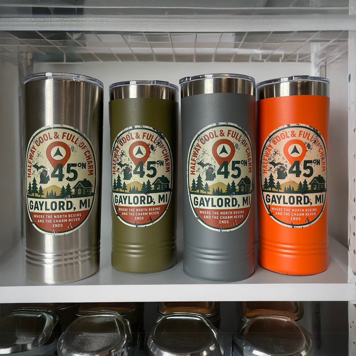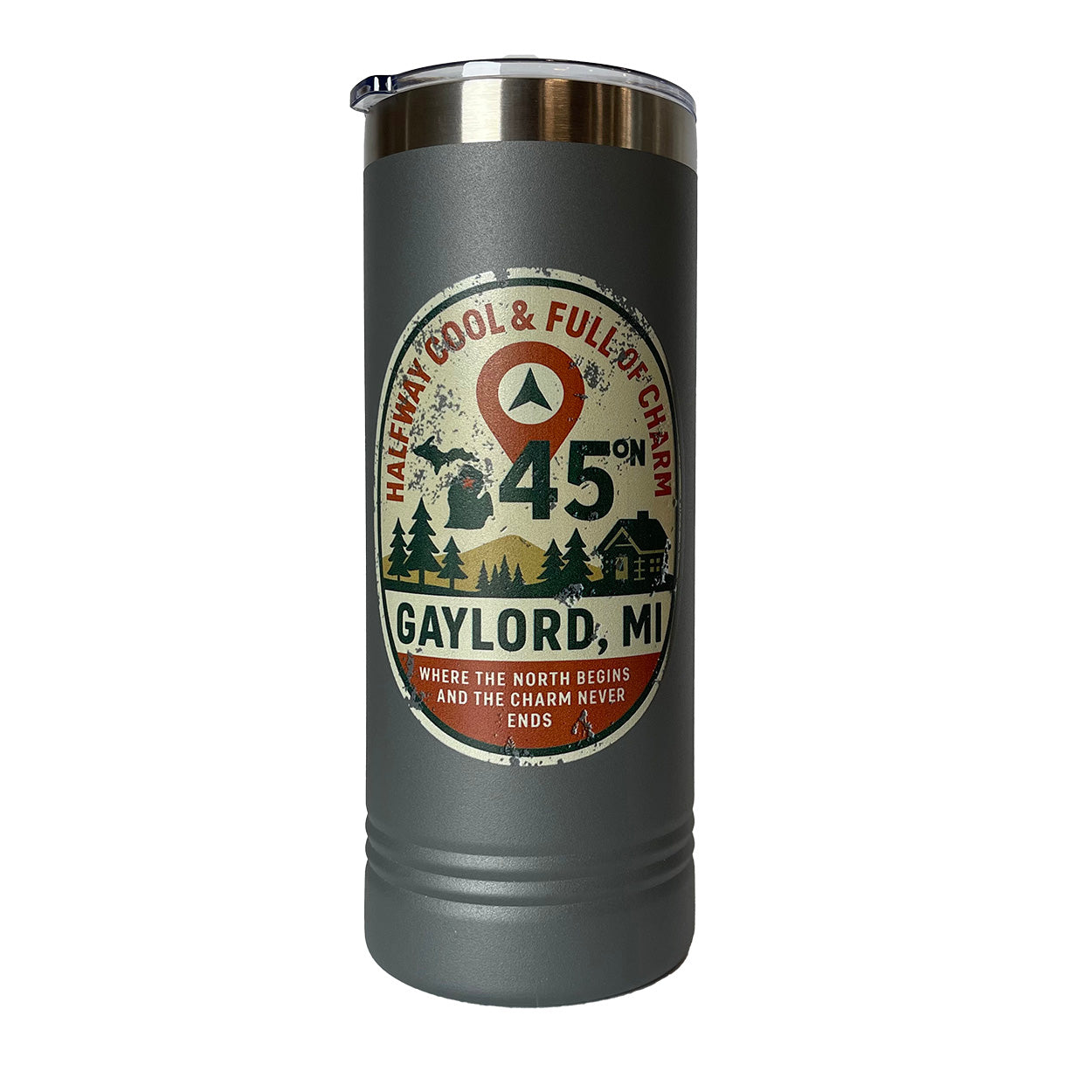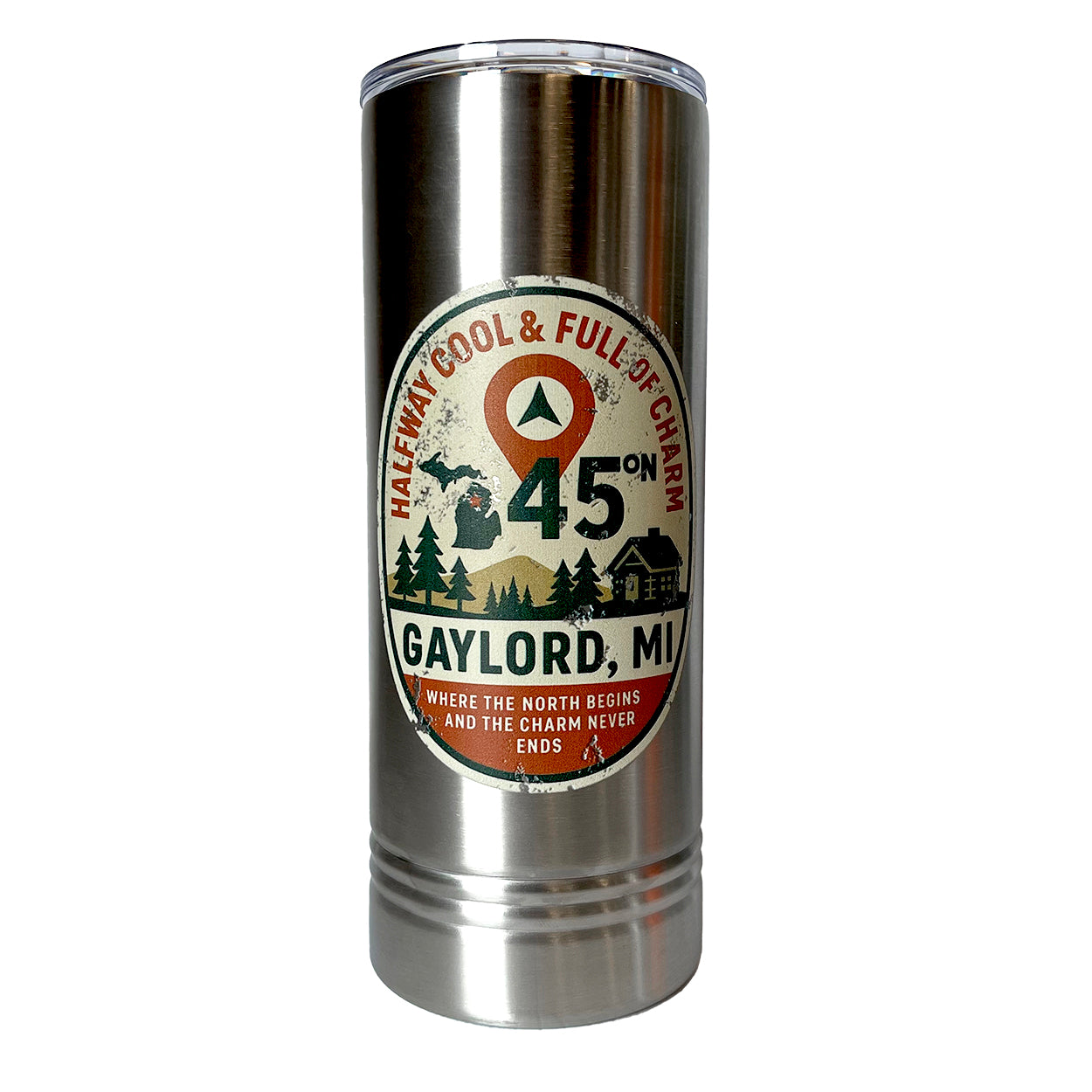 Stay refreshed in style with our Halfway Cool & Full of Charm tumbler – a tribute to Gaylord, Michigan and the iconic 45th parallel. Featuring bold, full-color artwork that reads “Where the North Begins and the Charm Never Ends,” this eye-catching drinkware is a perfect mix of rugged and nostalgic.