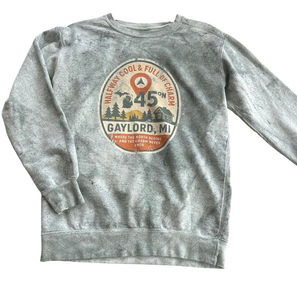 Celebrate Gaylord, Mi in laid-back comfort with this soft, lived-in crew. Featuring a vintage-style 45th Parallel design that proudly reads "Halfway Cool & Full of Charm," this shirt reps Northern Michigan in style.
