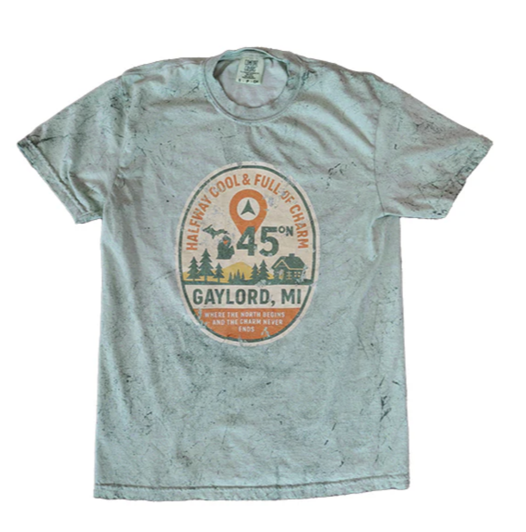 Celebrate Gaylord, Mi in laid-back comfort with this soft, lived-in tee. Featuring a vintage-style 45th parallel design that proudly reads "Halfway Cool & Full of Charm," this shirt reps Northern Michigan in style.