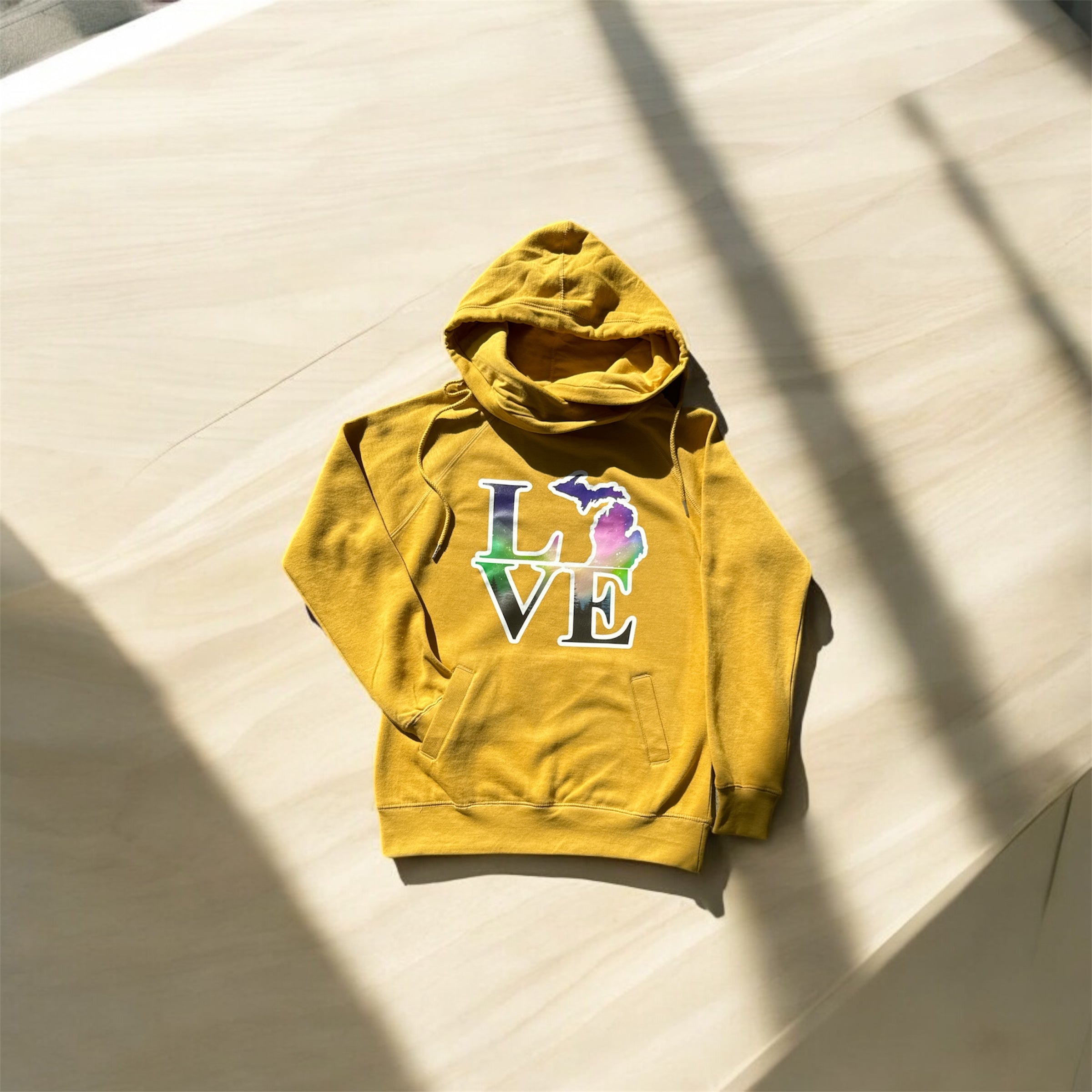 Stay cozy and show your Michigan pride with our funnel neck hoodie featuring a stunning LOVE design. The stacked letters include a unique twist—the “O” is shaped like Michigan’s Upper and Lower Peninsulas, and the entire graphic is filled with a breathtaking image of the iconic Northern Lights. With its soft fabric and stylish funnel neck for extra warmth and comfort, this hoodie is perfect for anyone who loves the beauty of the Mitten State. A must-have for chilly days and starry nights!