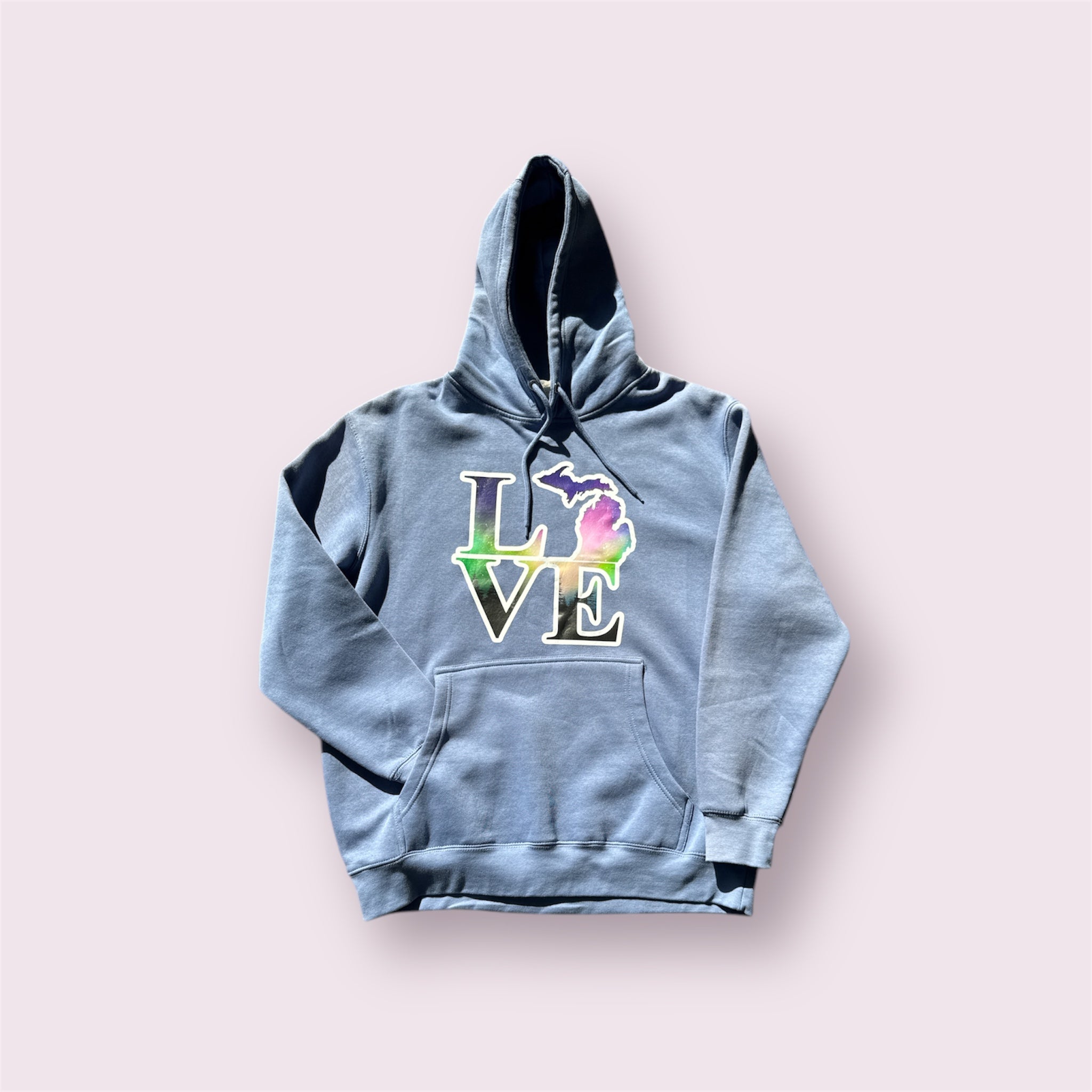 Show off your Michigan pride in cozy style with this eye-catching hoodie! Featuring a stacked LOVE design, the “O” is creatively replaced with a silhouette of Michigan’s Upper and Lower Peninsulas. The entire graphic is filled with a breathtaking image of the iconic Northern Lights, capturing the beauty and wonder of the Mitten State. Soft, comfortable, and perfect for any Michigan lover, this hoodie is a must-have for chilly nights and outdoor adventures.
