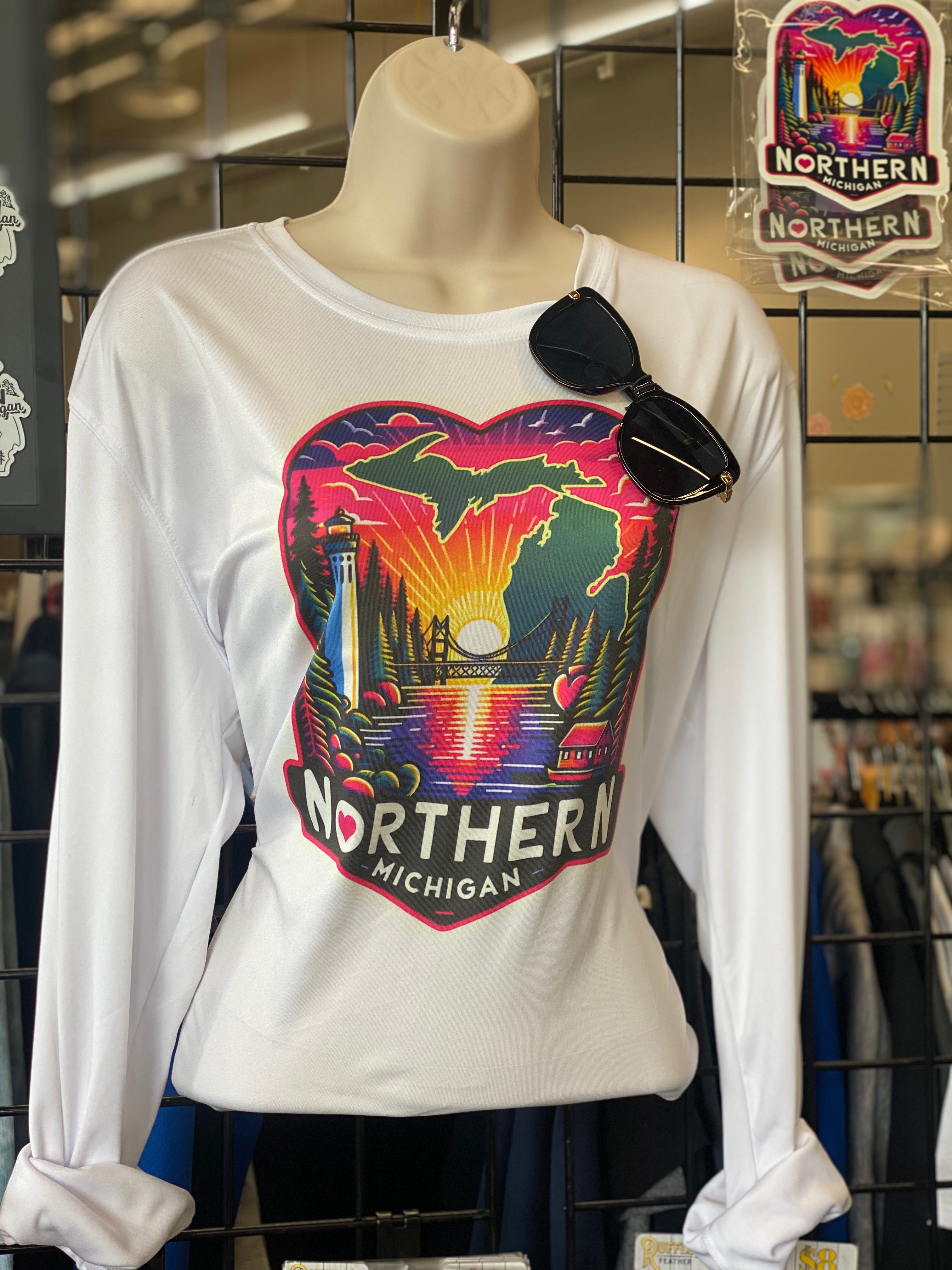 Stay Protected from the sun with this awesome Northern Michigan Love UPF 50+ shirt. Featuring A beautiful sunset with the iconic mackinaw bridge and michigan mitten in the background, this design is perfect for those who love what the northern lifestyle brings.