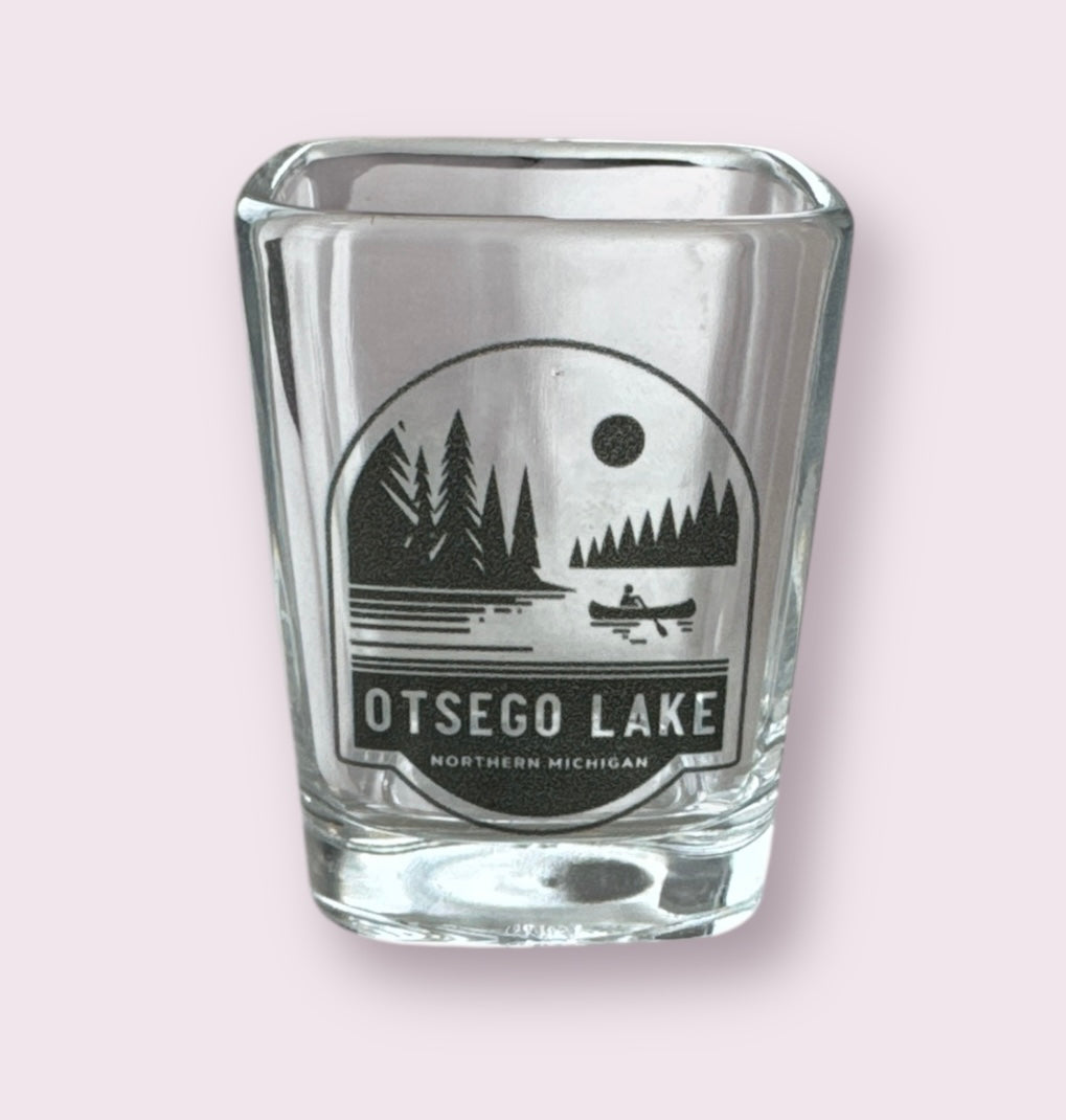 Celebrate the beauty of Gaylord, Michigan’s Otsego Lake with this clear short square shot glass, featuring our exclusive Ruffled Feather Otsego Shores design. The glass showcases a striking portrait cutout of a canoeist on the lake, capturing the serene and scenic charm of Northern Michigan.