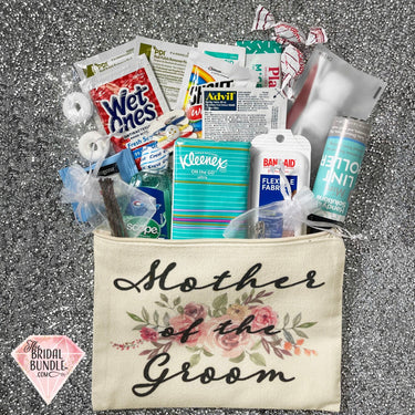 This (roughly 7.75″w x x5.5″h) beige canvas zipper bag comes with the front saying “Mother of the Bride” over a watercolor floral print and comes already stuffed with an array of the just-in-case products you or the mother of the Groom could use on any wedding events.