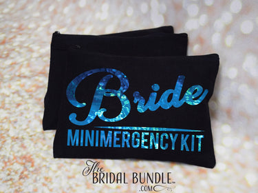 This (roughly 7.75″w x x5.5″h) black canvas zipper bag comes with your color choice of foil on the front saying “Bride” in a bold cursive font, featuring a heart on the left. This mini emergency bag is empty or stuffed with products needed for the wedding day, bachelorette party, or a purse bag afterward.