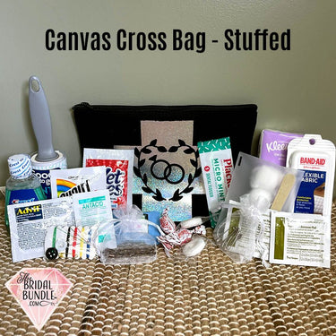 Our (roughly 8.25×4.75) black canvas zipper emergency bag comes with your color choice of foil on the front with a large cross and rings in the middle. This mini emergency bag is available empty or already stuffed with products that could be needed for the wedding day, bachelorette party, or a purse bag after.