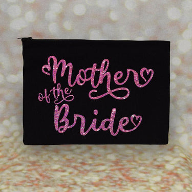 This (roughly 7.75″w x x5.5″h) black canvas zipper bag comes with your color choice of glitter on the front saying “Mother of the Bride” and comes already stuffed with an array of the just-in-case products you or the mother of the Bride could use on the wedding day.